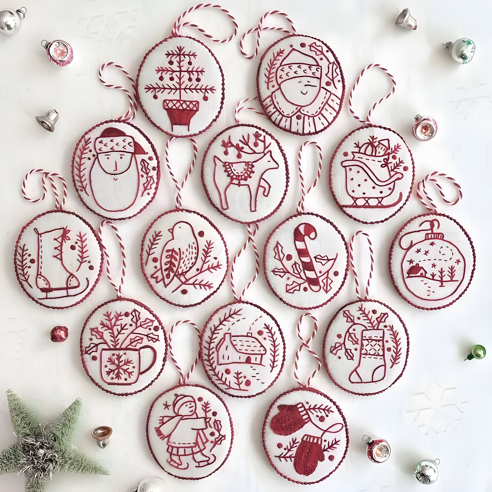 🤩Stitch up 14 Redwork Christmas ornaments to decorate your holiday tree! Each ornament measures about 3" in length.